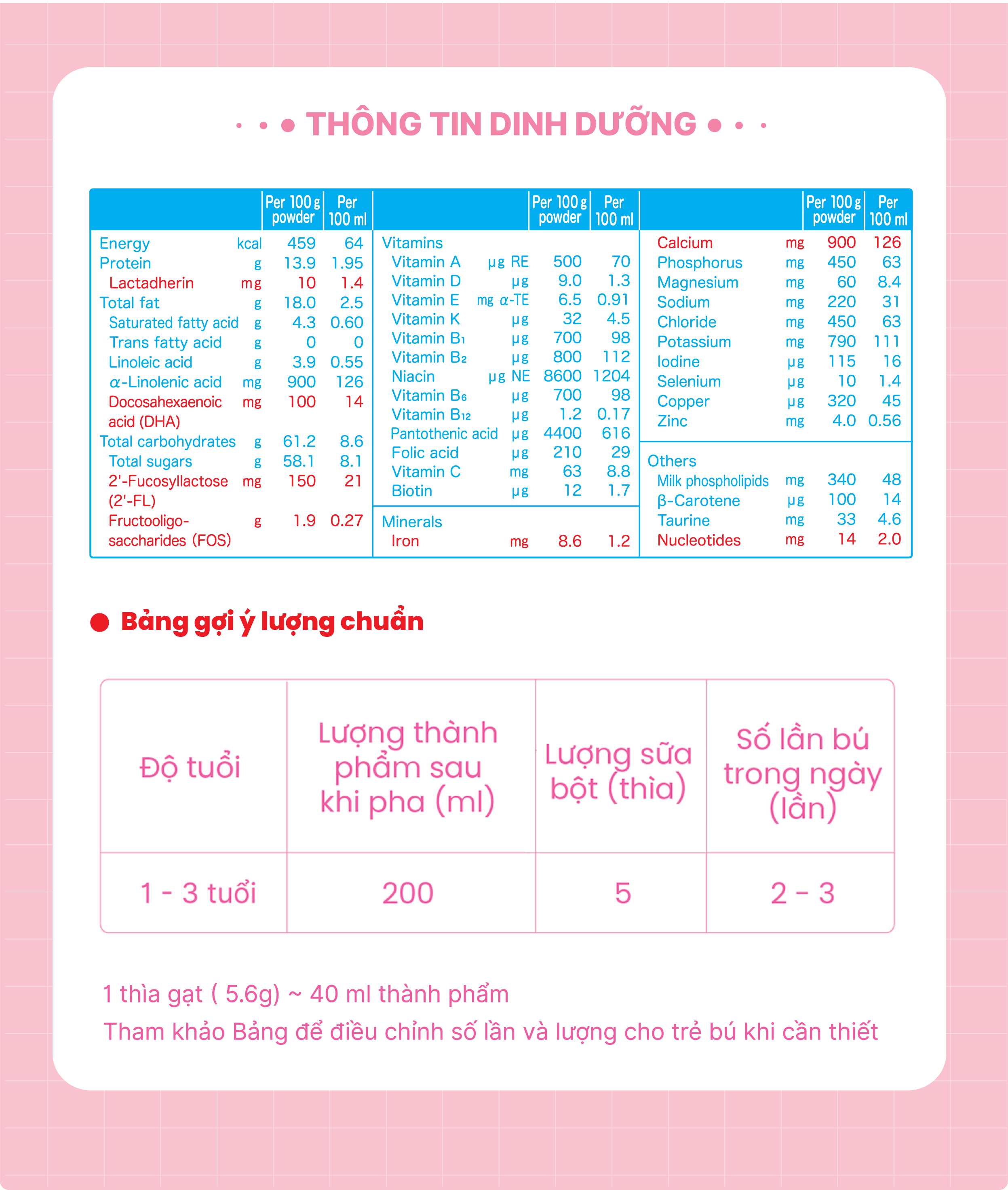 | Lactose, chất béo tổng hợp (mỡ heo, dầu đậu nành, dầu dừa, dầu cá tinh luyện, axit arachidonic, cholesterol), đạm whey cô đặc, canxi caseinat, đạm whey khử khoáng cô đặc, fructooligosaccharides, bột buttermilk, bột sữa tách béo, canxi photphat, magie clorua, canxi cacbonat, kali clorua, kali cacbonat, vitamin C, inositol, natri clorua, taurine, ferric pyrophotphat, canxi clorua, vitamin E, kẽm sunfat, disodium 5'-guanylate, 5'-adenylic acid, đồng sunfat, vitamin A, vitamin B1, vitamin B2, vitamin B6, β- Carotene, axit folic, mangan sunfat, kali iotua, vitamin K1, biotin, vitamin D3, natri selenit, vitamin B12. |